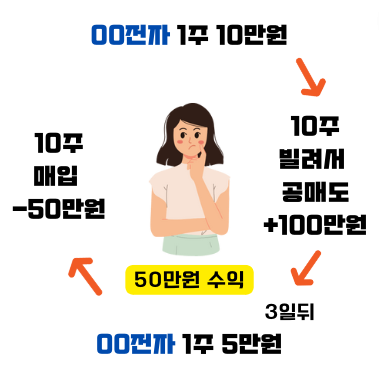 조금 더 쉽게 설명하면 하락할 것 같은 주식을 빌려서 매매를 한 후, 그 주가가 떨어졌을 때 그 주식을 사서 갚는다.