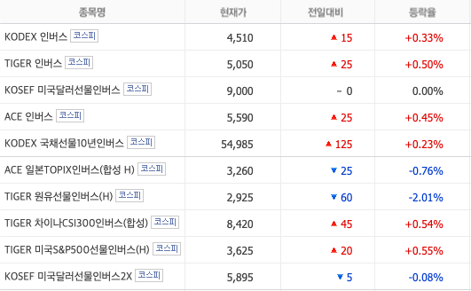 투자방법은 상장되어 있는 인버스 ETF를 주식처럼 구매하면 됩니다.